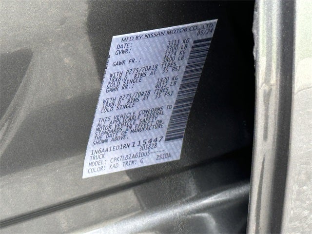 Gun Metallic 2024 Nissan Titan PRO-4X 4WD 9-Speed Automatic 5.6L V8 DOHC 32V LEV3-ULEV70 400hp **ONE OWNER**, **BACK UP CAMERA, ***NISSAN CERTIFIED PREOWNED (CPO), Titan PRO-4X, Nissan Certified Certified, 4D Crew Cab, 5.6L V8 DOHC 32V LEV3-ULEV70 400hp, 9-Speed Automatic, 4WD, Gun Metallic, Black Vinyl, 3.692 Axle Ratio, Apple CarPlay/Android Auto, Auto High-beam Headlights, Auto-leveling suspension, Blind Spot Warning, Cloth Seat Trim w/Vinyl Bolsters, Delay-off headlights, Front Bucket Seats, Front fog lights, Fully automatic headlights, Garage door transmitter: HomeLink, Heated door mirrors, Navigation system: NissanConnect with Navigation and Services, Off Road Protection Package, Power door mirrors, Power driver seat, Rear Parking Sensors, Remote keyless entry, Security system, Split folding rear seat, Telescoping steering wheel, Tilt steering wheel, Wheels: 18 x 8 Painted Dark Finish Alloy, 4-Wheel Disc Brakes, 6 Speakers, ABS brakes, Air Conditioning, Alloy wheels, AM/FM radio: SiriusXM, Auto-dimming Rear-View mirror, Automatic temperature control, Brake assist, Compass, Driver door bin, Driver vanity mirror, Dual front impact airbags, Dual front side impact airbags, Electronic Stability Control, Emergency communication system: NissanConnect Services, Front anti-roll bar, Front Captain's Seats, Front Center Armrest, Front dual zone A/C, Front reading lights, Front wheel independent suspension, Illuminated entry, Knee airbag, Leather steering wheel, Low tire pressure warning, Occupant sensing airbag, Outside temperature display, Overhead airbag, Overhead console, Panic alarm, Passenger door bin, Passenger vanity mirror, Power steering, Power windows, Radio data system, Radio: NissanConnect w/Navigation, Rain sensing wipers, Rear anti-roll bar, Rear reading lights, Rear seat center armrest, Rear step bumper, Rear window defroster, Speed control, Speed-sensing steering, Speed-Sensitive Wipers, Steering wheel mounted audio controls, Tachometer, Traction control, Trip computer, Variably intermittent wipers, Voltmeter, Titan PRO-4X, 4D Crew Cab, 5.6L V8 DOHC 32V LEV3-ULEV70 400hp, 9-Speed Automatic, 4WD, Gun Metallic, Black Vinyl, 3.692 Axle Ratio, Apple CarPlay/Android Auto, Auto High-beam Headlights, Auto-leveling suspension, Blind Spot Warning, Cloth Seat Trim w/Vinyl Bolsters, Delay-off headlights, Front Bucket Seats, Front fog lights, Fully automatic headlights, Garage door transmitter: HomeLink, Heated door mirrors, Navigation system: NissanConnect with Navigation and Services, Off Road Protection Package, Power door mirrors, Power driver seat, Rear Parking Sensors, Remote keyless entry, Security system, Split folding rear seat, Telescoping steering wheel, Tilt steering wheel, Wheels: 18 x 8 Painted Dark Finish Alloy.