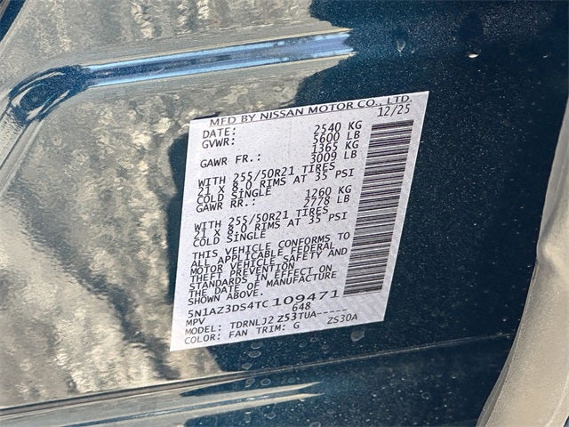 9-Speed Automatic, AWD, 10 Speakers, 21 Alloy Wheels, 4-Wheel Disc Brakes, ABS brakes, Air Conditioning, Alloy wheels, AM/FM radio: SiriusXM w/360L, Auto High-beam Headlights, Auto tilt-away steering wheel, Auto-dimming Rear-View mirror, Automatic temperature control, Brake assist, Bumpers: body-color, Child-Seat-Sensing Airbag, Compass, Delay-off headlights, Driver door bin, Driver vanity mirror, Dual front impact airbags, Dual front side impact airbags, Electronic Stability Control, Emergency communication system: NissanConnect Services, Four wheel independent suspension, Front anti-roll bar, Front Bucket Seats, Front Center Armrest, Front dual zone A/C, Front reading lights, Fully automatic headlights, Garage door transmitter: HomeLink, Heads-Up Display, Heated & Ventilated Front Bucket Seats w/Massage, Heated door mirrors, Heated front seats, Heated rear seats, Heated steering wheel, Illuminated entry, Knee airbag, Low tire pressure warning, Memory seat, Navigation system: NissanConnect with Navigation and Services, Occupant sensing airbag, Outside temperature display, Overhead airbag, Overhead console, Panic alarm, Passenger door bin, Passenger vanity mirror, Power door mirrors, Power driver seat, Power Liftgate, Power moonroof: Panoramic, Power passenger seat, Power steering, Power windows, Premium Paint, Quilted Semi-Aniline Leather-Appointed Seat Trim, Radio data system, Radio: NissanConnect w/Hybrid Radio, Rain sensing wipers, Rear anti-roll bar, Rear reading lights, Rear seat center armrest, Rear side impact airbag, Rear window defroster, Rear window wiper, Remote keyless entry, Security system, Speed control, Speed-Sensitive Wipers, Split folding rear seat, Spoiler, Steering wheel memory, Steering wheel mounted audio controls, Tachometer, Telescoping steering wheel, Tilt steering wheel, Traction control, Trip computer, Turn signal indicator mirrors, Variably intermittent wipers, Ventilated front seats, Wireless Apple CarPlay/Wireless Android Auto, 9-Speed Automatic, AWD. 9-Speed Automatic, AWD, 10 Speakers, 21 Alloy Wheels, 4-Wheel Disc Brakes, ABS brakes, Air Conditioning, Alloy wheels, AM/FM radio: SiriusXM w/360L, Auto High-beam Headlights, Auto tilt-away steering wheel, Auto-dimming Rear-View mirror, Automatic temperature control, Brake assist, Bumpers: body-color, Child-Seat-Sensing Airbag, Compass, Delay-off headlights, Driver door bin, Driver vanity mirror, Dual front impact airbags, Dual front side impact airbags, Electronic Stability Control, Emergency communication system: NissanConnect Services, Four wheel independent suspension, Front anti-roll bar, Front Bucket Seats, Front Center Armrest, Front dual zone A/C, Front reading lights, Fully automatic headlights, Garage door transmitter: HomeLink, Heads-Up Display, Heated & Ventilated Front Bucket Seats w/Massage, Heated door mirrors, Heated front seats, Heated rear seats, Heated steering wheel, Illuminated entry, Knee airbag, Low tire pressure warning, Memory seat, Navigation system: NissanConnect with Navigation and Services, Occupant sensing airbag, Outside temperature display, Overhead airbag, Overhead console, Panic alarm, Passenger door bin, Passenger vanity mirror, Power door mirrors, Power driver seat, Power Liftgate, Power moonroof: Panoramic, Power passenger seat, Power steering, Power windows, Premium Paint, Quilted Semi-Aniline Leather-Appointed Seat Trim, Radio data system, Radio: NissanConnect w/Hybrid Radio, Rain sensing wipers, Rear anti-roll bar, Rear reading lights, Rear seat center armrest, Rear side impact airbag, Rear window defroster, Rear window wiper, Remote keyless entry, Security system, Speed control, Speed-Sensitive Wipers, Split folding rear seat, Spoiler, Steering wheel memory, Steering wheel m Price includes: $4000 - Nissan Customer Cash $500 - Nissan Conditional Offer - College Graduate