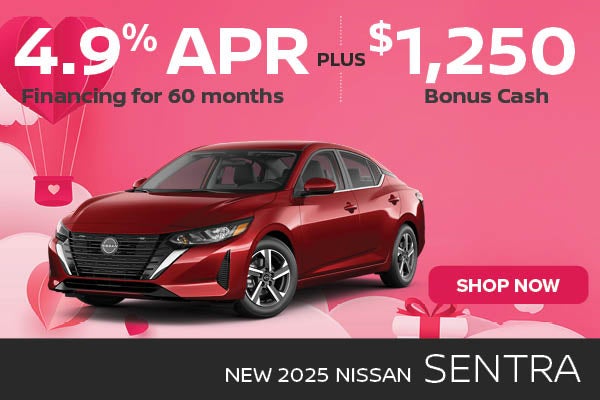 Available on 2025 Sentra (Trims: all) from new Dealer stock. 4.9% APR financing for 60 months. Other APR rate/terms available on this model include: 3.9% APR financing for 36 months (e.g. $18.83 per month per $1,000 financed at 4.9% for 60 months, $29.48 per month per $1,000 financed at 3.9% for 36 months on all new above-noted vehicles in dealer stock.). Actual down payment may vary. Subject to residency restrictions. Subject to NMAC credit approval. Not all buyers qualify. Dealer contribution may affect actual price set by Dealer. Contact Dealer for details. APR Offer Ends 03/02/2026.. [1] $1,250 Bonus Cash available on 2025 Sentra . Bonus Cash valid 02/03/2026 through 03/02/2026. No down payment required. Available on lease and purchase. Must take delivery from new dealer stock. See dealer for details. Subject to residency restrictions.