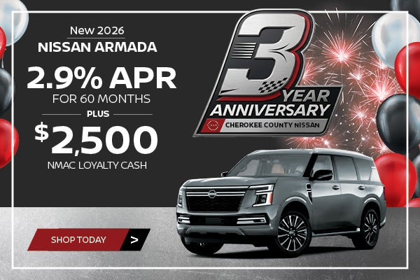 Available on 2026 Armada (Trims: all) from new Dealer stock. 2.9% APR financing for 60 months. Other APR rate/terms available on this model include: 1.9% APR financing for 36 months (e.g. $17.92 per month per $1,000 financed at 2.9% for 60 months, $28.60 per month per $1,000 financed at 1.9% for 36 months on all new above-noted vehicles in dealer stock.). Actual down payment may vary. Subject to residency restrictions. Subject to NMAC credit approval. Not all buyers qualify. Dealer contribution may affect actual price set by Dealer. Contact Dealer for details. APR Offer Ends 05/04/2026.. [1] Available only to well-qualified customers who are current Nissan or INFINITI owners or lessees with proof of eligibility. Offer valid only when financed through NMAC. Must take delivery from new dealer stock. Subject to residency restrictions. Transferable within the same household with proof of residency. Limit one offer per individual. Can be combined with other loyalty or conquest offers. Contact dealer for details. Ends 05/04/2026.