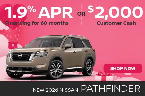 Available on 2026 Pathfinder (Trims: all) from new Dealer stock. 1.9% APR financing for 60 months (e.g. $17.48 per month per $1,000 financed at 1.9% for 60 months). Actual down payment may vary. Subject to residency restrictions. Subject to NMAC credit approval. Not all buyers qualify. Dealer contribution may affect actual price set by Dealer. Contact Dealer for details. APR Offer Ends 03/02/2026.$2,000 Customer Cash available only to well-qualified customers who lease or purchase a 2026 Pathfinder from new dealer stock. Offer valid only when financed through Nissan Motor Acceptance Corporation (NMAC) through a NMAC standard lease or APR. Offer not compatible with NMAC special APR or special lease programs. Offer Ends 03/02/2026.