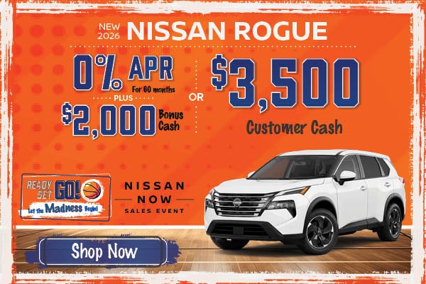 Available on 2026 Rogue (Trims: all) from new Dealer stock. 0.0% APR financing for 60 months (e.g. $16.67 per month per $1,000 financed at 0.0% for 60 months). Actual down payment may vary. Subject to residency restrictions. Subject to NMAC credit approval. Not all buyers qualify. Dealer contribution may affect actual price set by Dealer. Contact Dealer for details. APR Offer Ends 03/31/2026. $3,500 Retail Customer Cash available to customers who purchase a 2026 Rogue from new dealer stock. Offer not compatible with NMAC special APR or special lease programs. Offer Ends 03/31/2026. $2,000 Bonus Cash available on 2026 Rogue. Bonus Cash valid 03/03/2026 through 03/31/2026. No down payment required. Available on lease and purchase. Must take delivery from new dealer stock. See dealer for details. Subject to residency restrictions.
