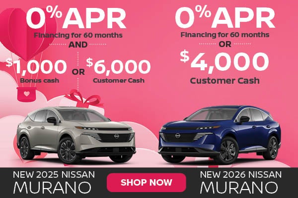 Available on 2026 Murano (Trims: All) from new Dealer stock. 0.0% APR financing for 60 months (e.g. $16.67 per month per $1,000 financed at 0.0% for 60 months). Actual down payment may vary. Subject to residency restrictions. Subject to NMAC credit approval. Not all buyers qualify. Dealer contribution may affect actual price set by Dealer. Contact Dealer for details. APR Offer Ends 03/02/2026.$4,000 Retail Customer Cash available to customers who purchase a 2026 Murano from new dealer stock. Offer not compatible with NMAC special APR or special lease programs. Offer Ends 03/02/2026.Available on 2025 Murano (Trims: all) from new Dealer stock. 0.0% APR financing for 60 months. Other APR rate/terms available on this model include: 3.9% APR financing for 72 months (e.g. $16.67 per month per $1,000 financed at 0.0% for 60 months, $15.60 per month per $1,000 financed at 3.9% for 72 months on all new above-noted vehicles in dealer stock.). Actual down payment may vary. Subject to residency restrictions. Subject to NMAC credit approval. Not all buyers qualify. Dealer contribution may affect actual price set by Dealer. Contact Dealer for details. APR Offer Ends 03/02/2026.$5,000 Retail Customer Cash available to customers who purchase a 2025 Murano from new dealer stock. Offer not compatible with NMAC special APR or special lease programs. Offer Ends 03/02/2026.$1,000 Bonus Cash available on 2025 Murano . Bonus Cash valid 02/03/2026 through 03/02/2026. Offers cannot be combined. No down payment required. Available on lease and purchase. Must take delivery from new dealer stock. See dealer for details. Subject to residency restrictions.