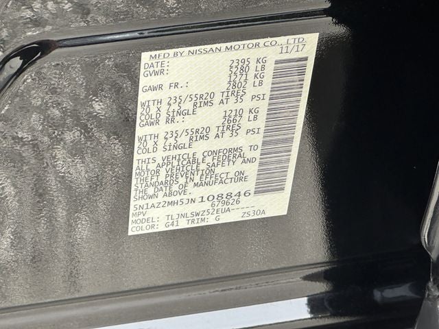 Magnetic Black 2018 Nissan Murano Platinum AWD CVT with Xtronic 3.5L V6 DOHC 24V Murano Platinum, 4D Sport Utility, 3.5L V6 DOHC 24V, CVT with Xtronic, AWD, Magnetic Black, Graphite Leather, Blind Spot Warning, Brake assist, Delay-off headlights, Electronic Stability Control, Front Bucket Seats, Front fog lights, Fully automatic headlights, Garage door transmitter: HomeLink, Heated front seats, Heated rear seats, Heated steering wheel, Leather Appointed Seat Trim, Memory seat, Navigation System, NissanConnect Services Powered By SiriusXM, Power driver seat, Power Liftgate, Power moonroof, Power passenger seat, Remote keyless entry, Security system, Split folding rear seat, Ventilated front seats, Wheels: 20 Machined Aluminum-Alloy, 11 Speakers, 4-Wheel Disc Brakes, 4.667 Axle Ratio, ABS brakes, Activation Disclaimer, Air Conditioning, Alloy wheels, AM/FM radio: SiriusXM, AM/FM/CD/MP3/WMA Audio System, Apple CarPlay/Android Auto, Auto tilt-away steering wheel, Auto-dimming Rear-View mirror, Automatic temperature control, Bumpers: body-color, Carpeted Floor Mats & Carpeted Cargo Mat, CD player, Child-Seat-Sensing Airbag, Climate-Controlled Front Bucket Seats, Compass, Driver door bin, Driver vanity mirror, Dual front impact airbags, Dual front side impact airbags, Emergency communication system: NissanConnect Services, Exterior Accent Lighting, Four wheel independent suspension, Front anti-roll bar, Front Center Armrest, Front dual zone A/C, Front reading lights, Heated door mirrors, Illuminated entry, Interior Accent Lighting, Knee airbag, Low tire pressure warning, Occupant sensing airbag, Outside temperature display, Overhead airbag, Overhead console, Panic alarm, Passenger door bin, Passenger vanity mirror, Power door mirrors, Power steering, Power windows, Radio data system, Rear anti-roll bar, Rear Bumper Protector, Rear reading lights, Rear seat center armrest, Rear window defroster, Rear window wiper, Roof rack: rails only, Speed control, Speed-sensing steering, Speed-Sensitive Wipers, Splash Guards, Spoiler, Steering wheel memory, Steering wheel mounted audio controls, Tachometer, Telescoping steering wheel, Tilt steering wheel, Traction control, Trip computer, Turn signal indicator mirrors, Variably intermittent wipers, Murano Platinum, 4D Sport Utility, 3.5L V6 DOHC 24V, CVT with Xtronic, AWD, Magnetic Black, Graphite Leather, Blind Spot Warning, Brake assist, Delay-off headlights, Electronic Stability Control, Front Bucket Seats, Front fog lights, Fully automatic headlights, Garage door transmitter: HomeLink, Heated front seats, Heated rear seats, Heated steering wheel, Leather Appointed Seat Trim, Memory seat, Navigation System, NissanConnect Services Powered By SiriusXM, Power driver seat, Power Liftgate, Power moonroof, Power passenger seat, Remote keyless entry, Security system, Split folding rear seat, Ventilated front seats, Wheels: 20 Machined Aluminum-Alloy.