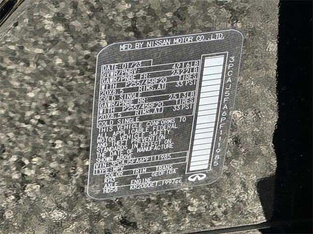 Black Obsidian 2023 INFINITI QX50 SPORT FWD CVT I4 **ONE OWNER**, **CARFAX CERTIFIED, QX50 SPORT, 4D Sport Utility, I4, CVT, FWD, Black Obsidian, Monaco Red Leather, Auto High-beam Headlights, Auto-dimming Rear-View mirror, Climate Controlled Front Bucket Seats, Delay-off headlights, Front Bucket Seats, Front Center Armrest, Front fog lights, Fully automatic headlights, Heated door mirrors, Heated front seats, Memory seat, Navigation system: INFINITI InTouch Navigation, Power door mirrors, Power driver seat, Power Liftgate, Power moonroof, Power passenger seat, Remote keyless entry, Semi-Aniline Leather-Appointed Seat Trim, Split folding rear seat, Telescoping steering wheel, Tilt steering wheel, Turn signal indicator mirrors, Ventilated front seats, Wheels: 20 Black Painted Machine Finished, 12 Speakers, 4-Wheel Disc Brakes, 5.846 Axle Ratio, ABS brakes, Air Conditioning, Alloy wheels, AM/FM radio: SiriusXM, Automatic temperature control, Bose Premium Audio System, Brake assist, Bumpers: body-color, CD player, Driver door bin, Driver vanity mirror, Dual front impact airbags, Dual front side impact airbags, Electronic Stability Control, Emergency communication system: INFINITI InTouch (1-year complimentary trial), Floor Mats, Four wheel independent suspension, Front anti-roll bar, Front dual zone A/C, Front reading lights, Garage door transmitter: HomeLink, Heated steering wheel, Illuminated entry, Illuminated Kick Plates, Knee airbag, Leather Shift Knob, Leather steering wheel, Literature Kit, Low tire pressure warning, Occupant sensing airbag, Outside temperature display, Overhead airbag, Overhead console, Panic alarm, Passenger door bin, Passenger vanity mirror, Power steering, Power windows, Radio data system, Rear anti-roll bar, Rear reading lights, Rear seat center armrest, Rear side impact airbag, Rear window defroster, Rear window wiper, Security system, Speed control, Speed-sensing steering, Speed-Sensitive Wipers, Splash Guards (Set of 4), Spoiler, Steering wheel mounted audio controls, Tachometer, Traction control, Trip computer, Variably intermittent wipers, QX50 SPORT, 4D Sport Utility, I4, CVT, FWD, Black Obsidian, Monaco Red Leather, Auto High-beam Headlights, Auto-dimming Rear-View mirror, Climate Controlled Front Bucket Seats, Delay-off headlights, Front Bucket Seats, Front Center Armrest, Front fog lights, Fully automatic headlights, Heated door mirrors, Heated front seats, Memory seat, Navigation system: INFINITI InTouch Navigation, Power door mirrors, Power driver seat, Power Liftgate, Power moonroof, Power passenger seat, Remote keyless entry, Semi-Aniline Leather-Appointed Seat Trim, Split folding rear seat, Telescoping steering wheel, Tilt steering wheel, Turn signal indicator mirrors, Ventilated front seats, Wheels: 20 Black Painted Machine Finished.