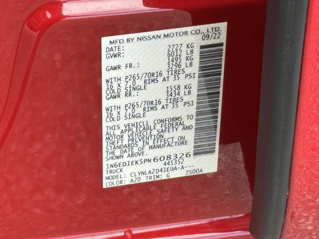 Red Alert 2023 Nissan Frontier S 4WD 9-Speed Automatic 3.8L DI DOHC 24V V6 **ONE OWNER**, **CARFAX CERTIFIED, ***NISSAN CERTIFIED PREOWNED (CPO), Frontier S, Nissan Certified Certified, 4D Crew Cab, 3.8L DI DOHC 24V V6, 9-Speed Automatic, 4WD, Red Alert, Charcoal Cloth, Apple CarPlay/Android Auto, Blind Spot Warning, Delay-off headlights, Front Bucket Seats, Fully automatic headlights, High Beam Assist (HBA), Intelligent Cruise Control, Lane Departure Warning System, Rear Automatic Braking (RAB), Rear Cross Traffic Alert (RCTA), Rear Sonar System, Remote keyless entry, Split folding rear seat, Technology Package, Tilt steering wheel, 16 Styled Steel Wheels, 3.692 Axle Ratio, 4 Speakers, 4-Wheel Disc Brakes, ABS brakes, Air Conditioning, AM/FM radio: SiriusXM, Anti-whiplash front head restraints, Brake assist, Bumpers: body-color, Carpeted Floor Mats, Cloth Seat Trim, Driver door bin, Dual front impact airbags, Dual front side impact airbags, Electronic Stability Control, Front anti-roll bar, Front Center Armrest, Front reading lights, Front wheel independent suspension, Illuminated entry, Knee airbag, Low tire pressure warning, Occupant sensing airbag, Overhead airbag, Panic alarm, Passenger door bin, Power steering, Power windows, Radio data system, Radio: SXM/AM/FM/AUX/USB Audio System w/4 Speakers, Rear anti-roll bar, Rear step bumper, Speed control, Speed-sensing steering, Splash Guards, Steering wheel mounted audio controls, Tachometer, Traction control, Trip computer, Variably intermittent wipers, Frontier S, 4D Crew Cab, 3.8L DI DOHC 24V V6, 9-Speed Automatic, 4WD, Red Alert, Charcoal Cloth, Apple CarPlay/Android Auto, Blind Spot Warning, Delay-off headlights, Front Bucket Seats, Fully automatic headlights, High Beam Assist (HBA), Intelligent Cruise Control, Lane Departure Warning System, Rear Automatic Braking (RAB), Rear Cross Traffic Alert (RCTA), Rear Sonar System, Remote keyless entry, Split folding rear seat, Technology Package, Tilt steering wheel.