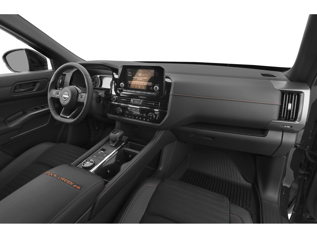 Super Black 2023 Nissan Pathfinder Rock Creek 4WD 9-Speed Automatic V6 4WD, 3rd row seats: bench, 4-Wheel Disc Brakes, 6 Speakers, ABS brakes, Air Conditioning, Alloy wheels, AM/FM radio: SiriusXM, Auto High-beam Headlights, Automatic temperature control, Axle Ratio: 4.334, Black Splash Guards (Set of 4), Brake assist, Delay-off headlights, Driver door bin, Driver vanity mirror, Dual front impact airbags, Dual front side impact airbags, Electronic Stability Control, Emergency communication system: NissanConnect Services, Four wheel independent suspension, Front anti-roll bar, Front Bucket Seats, Front Center Armrest, Front dual zone A/C, Front fog lights, Front reading lights, Fully automatic headlights, Heated door mirrors, Heated Front Bucket Seats, Heated front seats, Illuminated entry, Knee airbag, Leather steering wheel, Leatherette Seating Surfaces, Low tire pressure warning, Nissan USB Charging Cable Set, NissanConnect featuring Apple CarPlay and Android Auto, Occupant sensing airbag, Outside temperature display, Overhead airbag, Overhead console, Panic alarm, Passenger door bin, Passenger vanity mirror, Power door mirrors, Power driver seat, Power steering, Power windows, Radio data system, Radio: AM/FM Audio System w/NissanConnect, Rear air conditioning, Rear anti-roll bar, Rear Parking Sensors, Rear reading lights, Rear side impact airbag, Rear window defroster, Rear window wiper, Reclining 3rd row seat, Remote keyless entry, Rock Creek AS Floor Liners & Cargo Area Protector, Rock Creek Roof Rack, Roof rack, Security system, Speed control, Speed-sensing steering, Split folding rear seat, Spoiler, Steering wheel mounted audio controls, Tachometer, Telescoping steering wheel, Tilt steering wheel, Traction control, Trip computer, Turn signal indicator mirrors, Variably intermittent wipers, Wheels: 18 Beadlock Styled Design, 4WD.