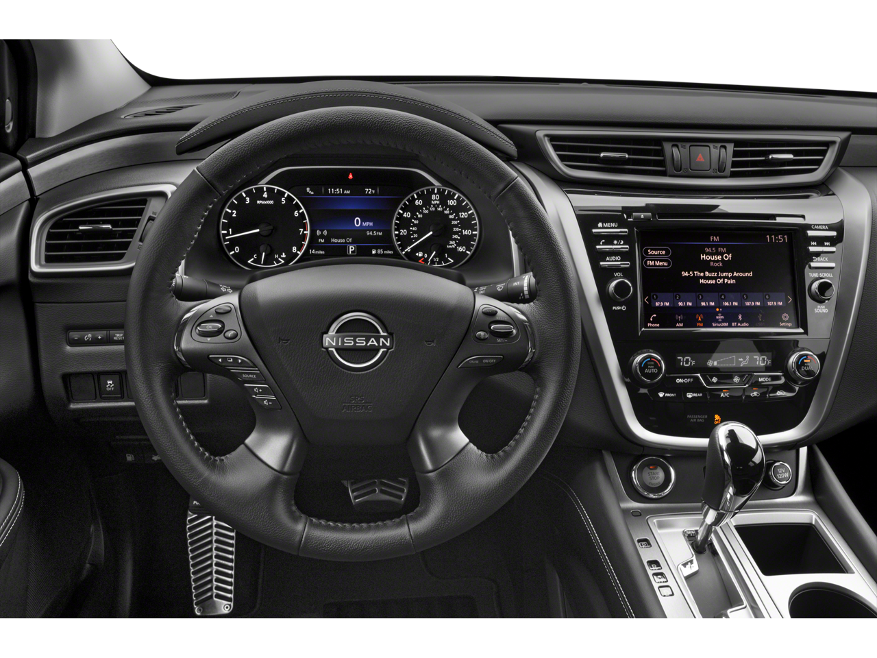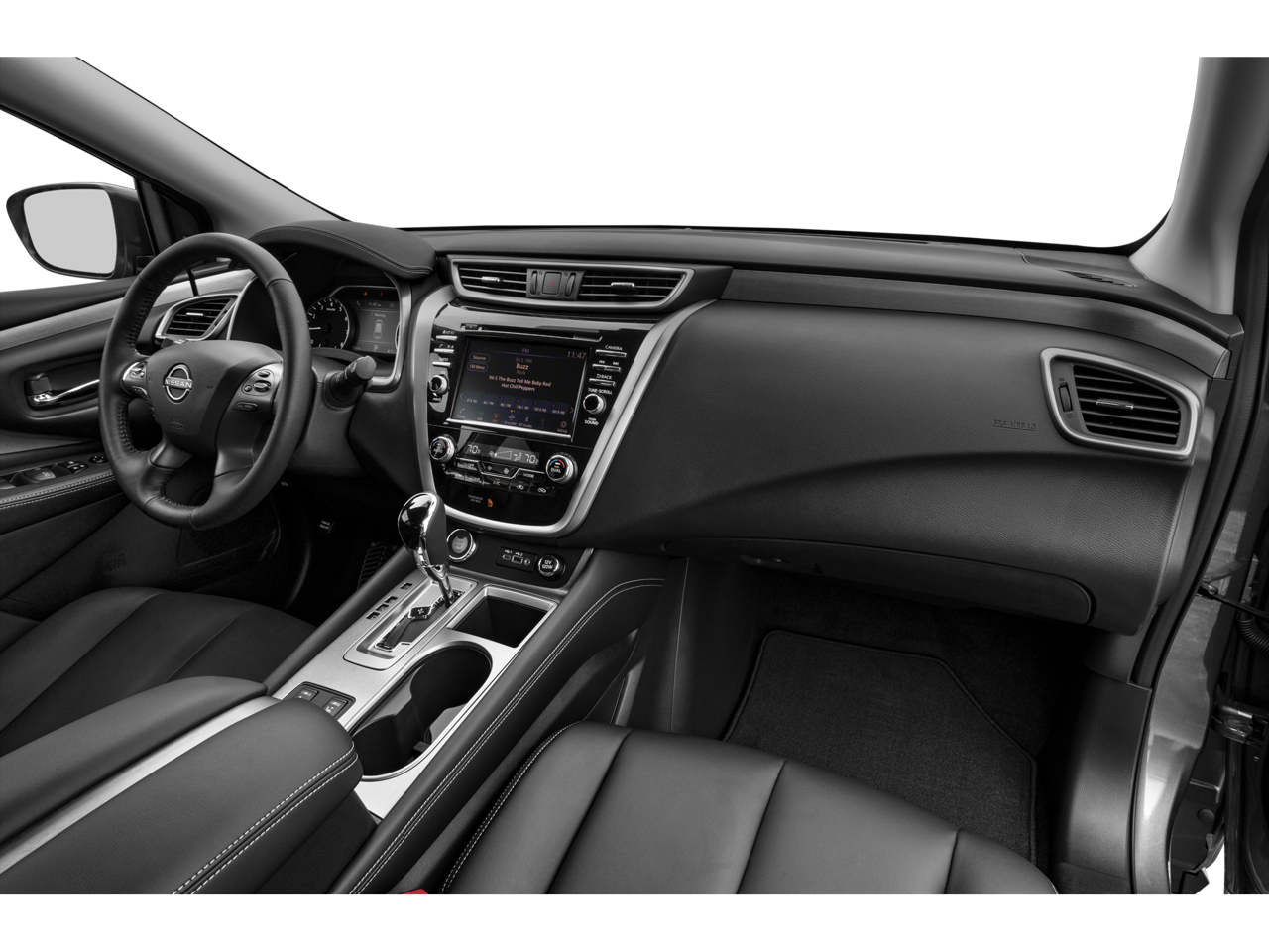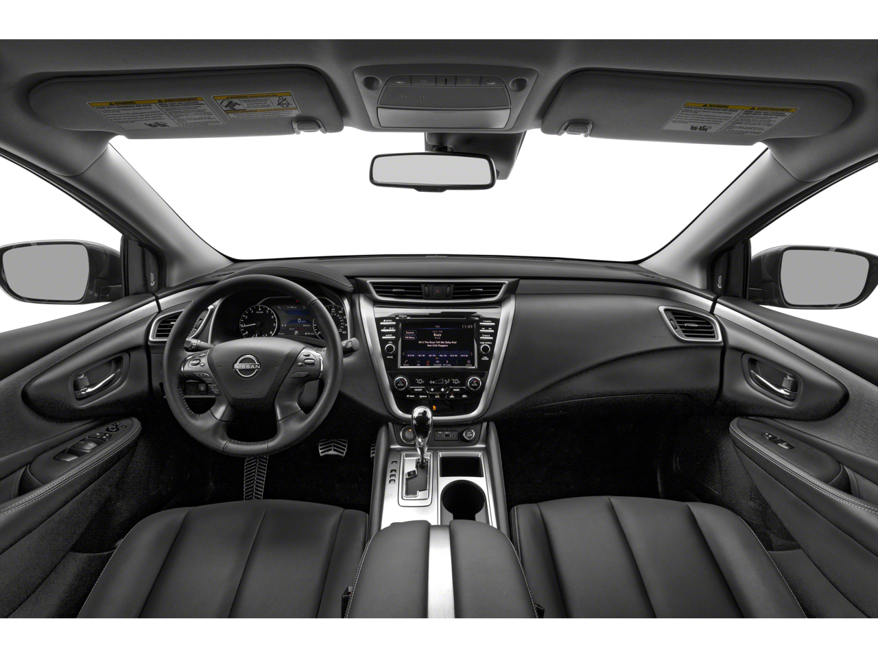 Super Black 2024 Nissan Murano SV FWD CVT with Xtronic 3.5L V6 DOHC 24V CVT with Xtronic, 4-Wheel Disc Brakes, 4.667 Axle Ratio, 6 Speakers, ABS brakes, Air Conditioning, Alloy wheels, AM/FM radio: SiriusXM, AM/FM/CD/MP3/WMA Audio System, Auto High-beam Headlights, Auto-dimming Rear-View mirror, Automatic temperature control, Black Splash Guards, Blind Spot Warning, Brake assist, Bumpers: body-color, CD player, Child-Seat-Sensing Airbag, Compass, Delay-off headlights, Driver door bin, Driver vanity mirror, Dual front impact airbags, Dual front side impact airbags, Electronic Stability Control, Four wheel independent suspension, Front anti-roll bar, Front Bucket Seats, Front Center Armrest, Front dual zone A/C, Front fog lights, Front reading lights, Fully automatic headlights, Heated door mirrors, Heated Front Bucket Seats, Heated front seats, Illuminated entry, Illuminated Kickplates, Knee airbag, Leather steering wheel, Leatherette-Appointed Seat Trim, Low tire pressure warning, Midnight Edition Badge, Midnight Edition Carpeted Floor Mats, NissanConnect featuring Apple CarPlay and Android Auto, Occupant sensing airbag, Outside temperature display, Overhead airbag, Overhead console, Panic alarm, Passenger door bin, Passenger vanity mirror, Power door mirrors, Power driver seat, Power passenger seat, Power steering, Power windows, Radio data system, Rear anti-roll bar, Rear reading lights, Rear seat center armrest, Rear side impact airbag, Rear window defroster, Rear window wiper, Remote keyless entry, Security system, Speed control, Speed-sensing steering, Speed-Sensitive Wipers, Splash Guards & Illuminated Kick Plates, Split folding rear seat, Spoiler, Steering wheel mounted audio controls, SV Midnight Edition Package, Tachometer, Telescoping steering wheel, Tilt steering wheel, Traction control, Trip computer, Turn signal indicator mirrors, Variably intermittent wipers, Wheels: 18 Machined Aluminum-Alloy, Wheels: 20 Gloss Black Aluminum Alloy, CVT with Xtronic.