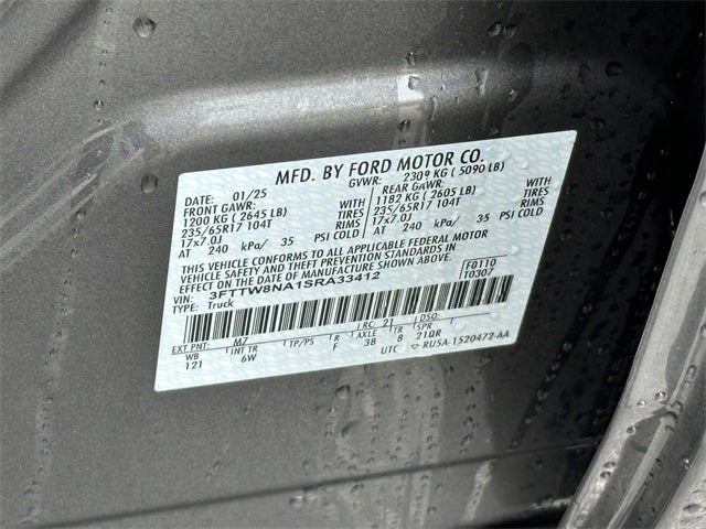 Gray Metallic 2025 Ford Maverick Tremor AWD 8-Speed Automatic EcoBoost 2.0L I4 GTDi DOHC Turbocharged VCT Maverick Tremor, 4D Crew Cab, EcoBoost 2.0L I4 GTDi DOHC Turbocharged VCT, 8-Speed Automatic, AWD, Gray Metallic, Black Onyx Premium Synthetic, ActiveX Trimmed Heated Front Bucket Seats, Apple CarPlay/Android Auto, Auto High-beam Headlights, Delay-off headlights, Equipment Group 602A, Exterior Parking Camera Rear, Front Bucket Seats, Fully automatic headlights, Heated door mirrors, Heated front seats, Heated steering wheel, Navigation system: Connected Navigation, Outside temperature display, Power door mirrors, Power driver seat, Power Moonroof, Remote keyless entry, Telescoping steering wheel, Tilt steering wheel, Wheels: 17 Machined-Face Tarnished Dark Painted, 3.63 Axle Ratio, 4-Wheel Disc Brakes, 8 Speakers, ABS brakes, Air Conditioning, Alloy wheels, AM/FM radio: SiriusXM with 360L, Automatic temperature control, Brake assist, Bumpers: body-color, Compass, Driver door bin, Driver vanity mirror, Dual front impact airbags, Dual front side impact airbags, Electronic Stability Control, Emergency communication system: SYNC 4 911 Assist, Four wheel independent suspension, Front anti-roll bar, Front Center Armrest, Front dual zone A/C, Front reading lights, Illuminated entry, Knee airbag, Low tire pressure warning, Occupant sensing airbag, Overhead airbag, Overhead console, Panic alarm, Passenger door bin, Passenger vanity mirror, Power steering, Power windows, Radio data system, Radio: AM/FM Stereo w/8 Speakers, Rear anti-roll bar, Rear seat center armrest, Rear step bumper, Security system, SiriusXM w/360L, Speed control, Speed-sensing steering, Steering wheel mounted audio controls, SYNC 4 w/Enhanced Voice Recognition, Tachometer, Traction control, Trip computer, Maverick Tremor, 4D Crew Cab, EcoBoost 2.0L I4 GTDi DOHC Turbocharged VCT, 8-Speed Automatic, AWD, Gray Metallic, Black Onyx Premium Synthetic, ActiveX Trimmed Heated Front Bucket Seats, Apple CarPlay/Android Auto, Auto High-beam Headlights, Delay-off headlights, Equipment Group 602A, Exterior Parking Camera Rear, Front Bucket Seats, Fully automatic headlights, Heated door mirrors, Heated front seats, Heated steering wheel, Navigation system: Connected Navigation, Outside temperature display, Power door mirrors, Power driver seat, Power Moonroof, Remote keyless entry, Telescoping steering wheel, Tilt steering wheel, Wheels: 17 Machined-Face Tarnished Dark Painted.